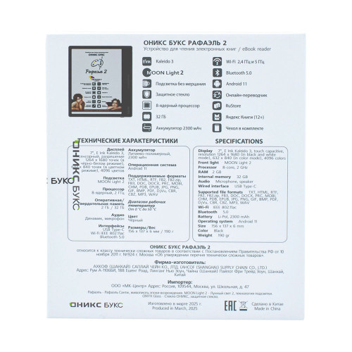 Sensorlu və ağıllı işıqlandırma E Ink Kaleido 3 rəngli ekranı oxumağı rahat edir, Android OS 11, Vi-fi modulu, Bluetooth xarici cihazlar və proqramlar ilə yaxşı əlaqə qurmağa imkan verir. ONYX BOOX Raphael audiokitab və musiqi dinləmək imkanına malikdir. Kitab nazik gövdədədir və yan tərəfində idarəetmə düymələri var. Goruyucu örtük komplektə daxildir.